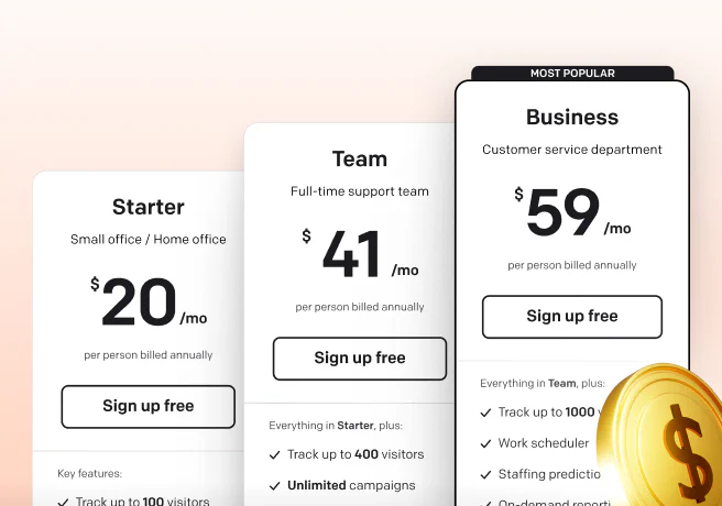 Visit our pricing page and find the subscription plan that's best for your needs, from a free plan for new users to premium plans with advanced features. Unlike Drift, LiveChat pricing is clear and upfront, perfect for small businesses and large teams alike. No meetings or hidden fees.